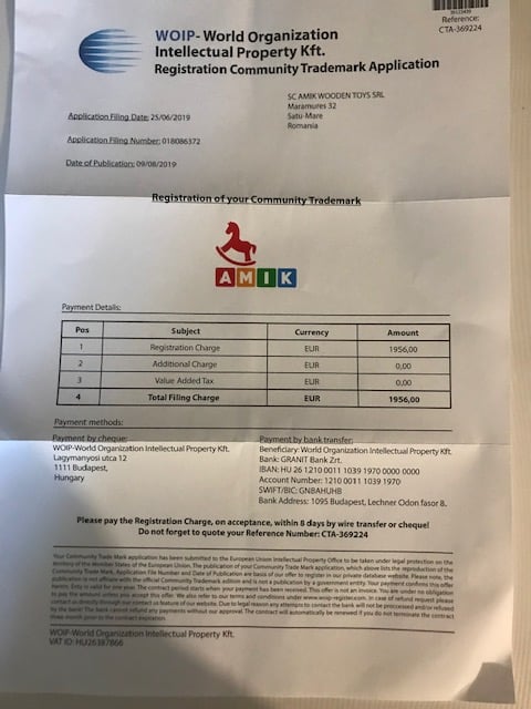 O buna perioada de timp, aceste facturi inselatoare erau trimise de catre WOIP – World Organization Intellectual Property Kft. Registration Community Trademark Application, o entitate juridica cu presupus sediu in Ungaria.”